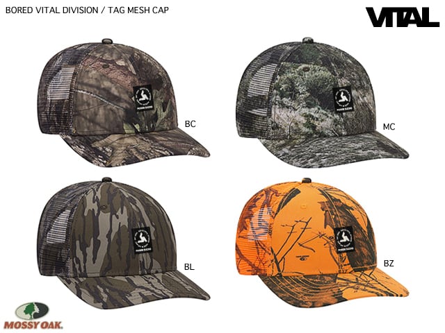 BOREDではお馴染みとなりますUSAハンティングメーカーMOSSY OAK社製のライセンスドカモフラージュを使用したポリエステルツイルメッシュキャップです。