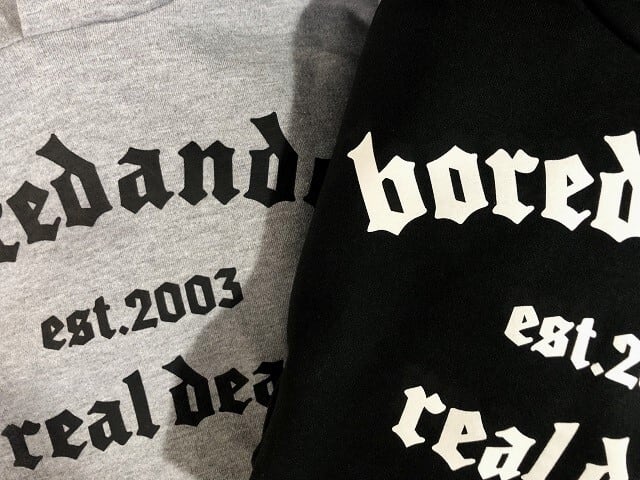 ボディカラーはブラックとヘザーグレーの2カラー展開とし胸部にはBOREDで作成した完全オリジナルのゴシック系フォントを使用したカレッジデザインを、後首下にはBOREDのボックスロゴをシルクスクリーンでプリントしています。