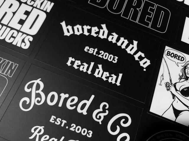 今回の2025 A4 STICKER SHEETもA4サイズにハーフカットで切り抜ける20個のステッカーデザインを配置していますが、今回は定番のBOREDロゴに加えてBOREDオリジナルアパレルデザインでも使用したグラフィックも使用しています。