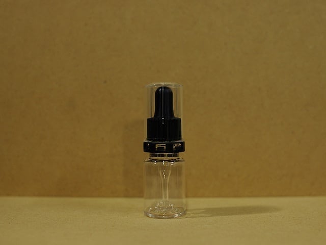 ボトルはPET製ながらガラスの様に透明度の高い肉厚で頑丈な物となり、キャップ部はセキュリティ付きのゴムとガラスによるスポイドをセミカスタムでアッセンブルした物となります。